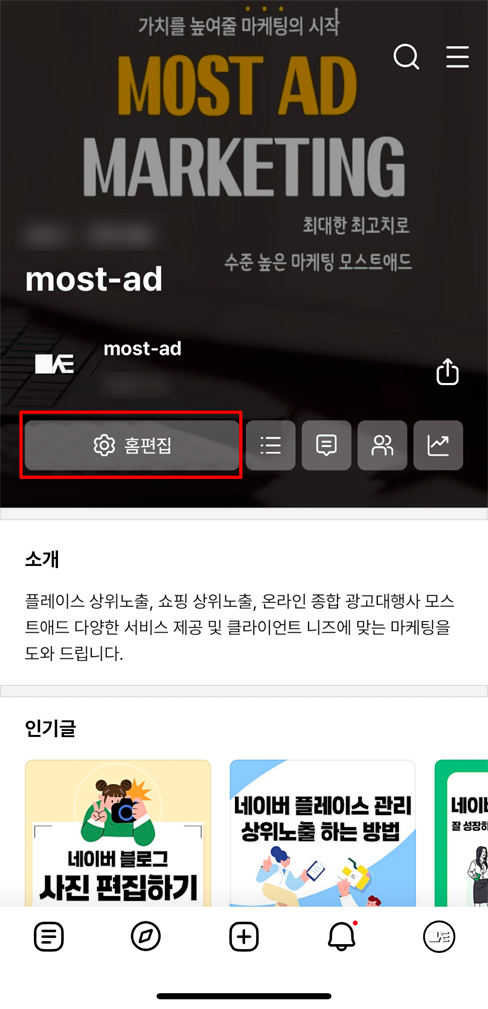 앱에서 로그인을 해준 후 내 블로그에 있는 홈 편집을 클릭해 줍니다.