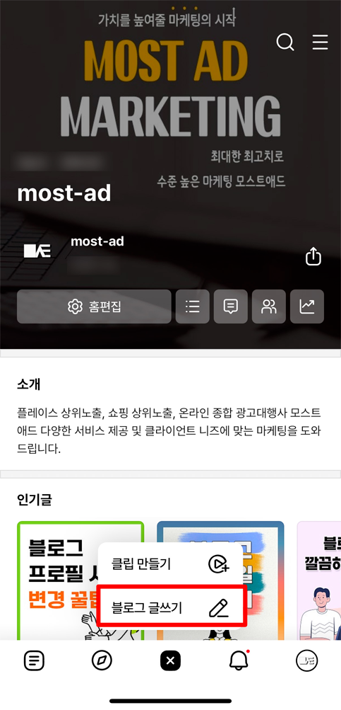 하단 버튼을 눌러서 블로그 글쓰기에 들어가줍니다.