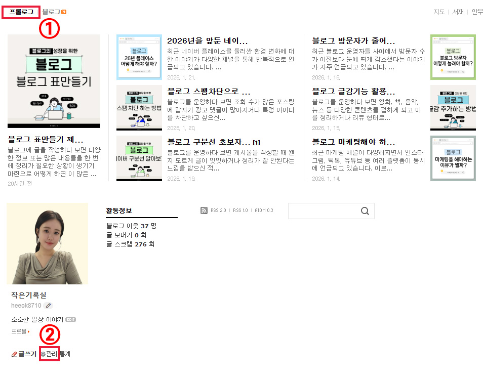 먼저 블로그 글 댓글 스타일변경을 하기 위해서는 본인의 블로그에 들어가시면 프롤로그, 블로그 등 각자 설정해놓으신 메뉴들로 구성되어 있습니다. 프롤로그를 클릭하게 되면 왼쪽 가장자리에 나의 프로필 박스가 보이시는데 오늘은 블로그의 전반적인 변경을 할 수 있는 관리 버튼을 눌러 페이지로 들어가주시면 됩니다.
