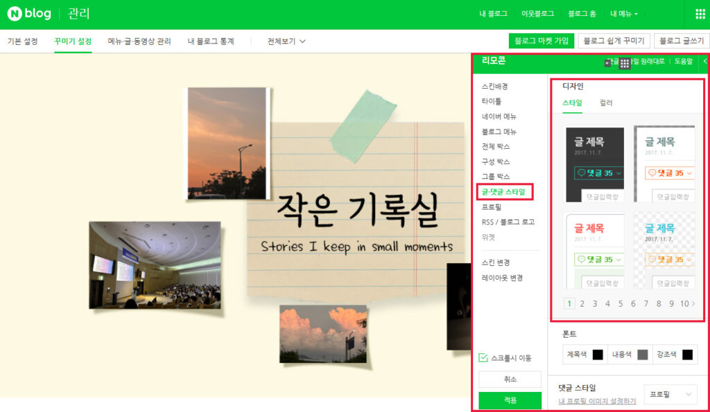 컬러 목록으로 들어가게 되면 이번에는 네이버에서 제공하는 디자인이 아닌 본인 스타일에 맞춰 본문 영역과 댓글 영역에 색을 변경할 수 있도록 되어있습니다. 블로그 글 댓글 스타일변경은 스타일 또는 컬러를 설정할 때 적용되는 디자인을 미리 볼 수 있도록 네이버 리모컨이 수시로 내가 선택한 디자인을 보여줍니다.
