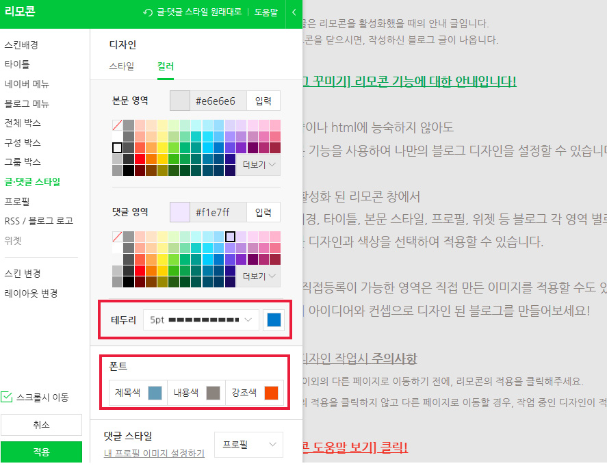오늘 배우는 블로그 글 댓글 스타일변경 방법은 제목 색, 내용 색, 강조색까지 원하는 색으로 설정까지 한 번에 할 수 있습니다.